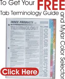 Index tabs are manufactured using a lamination process involving high heat. Consequently, the ink used is specially formulated to withstand the heat. This ink is called Laser-Sub ink. It is available in black and PMS colors. |